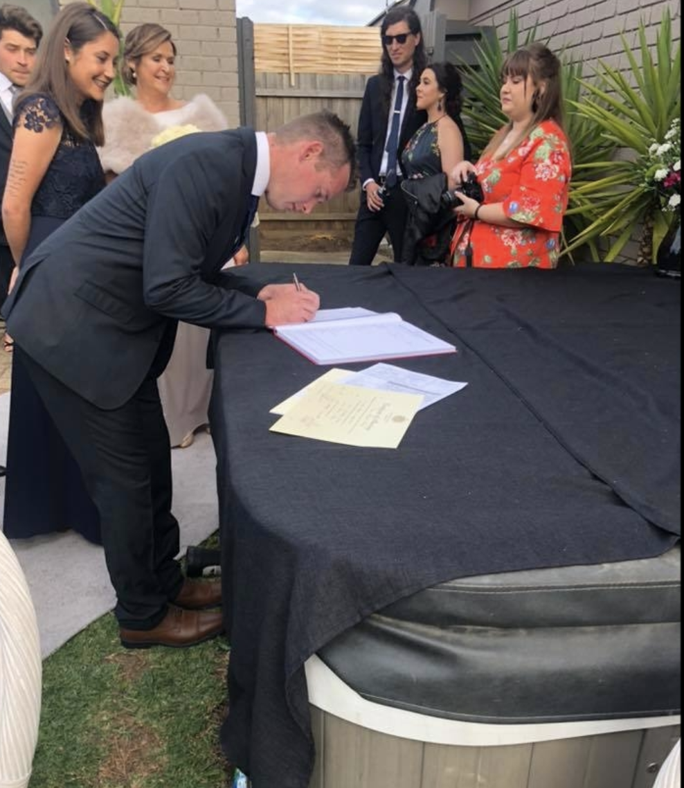 While some celebrants offer a signing table as an inclusion for their service, Russ prefers a more personal approach, as seen here with Tim and Jessie at their Glasshaus wedding.
